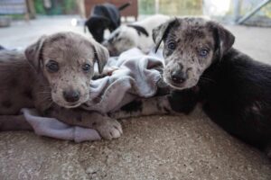 This year’s litter has a peculiar feature – the Australian Shepherds seem to carry the Merle gene, giving them a unique and attractive coat pattern. However, while this pattern may catch the eye, it brings along some challenges that are not kind to the pups. Sadly, three of the eight puppies have been born handicapped, being both deaf and blind.